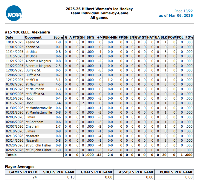 Personal ... played for Skaneateles High School Girls Hockey for two years... named team most improved player (2022-23 season)... Presidential Award... child of Melanie and Mike Kalisz and Richard Yockell... sibling to Shane
