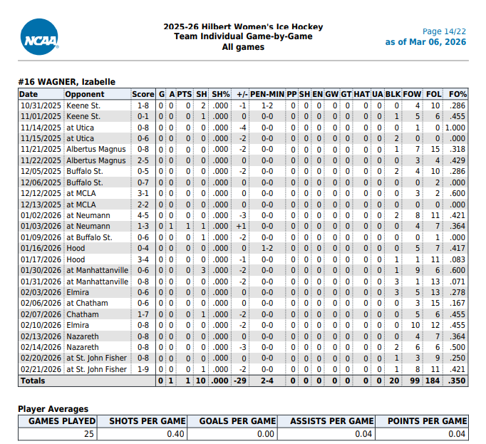 2025-26 sophomore... appeared in all 25 games... recorded an assist... fired 13 shots... bocked 21 shots... won 102 faceoffs... season stats