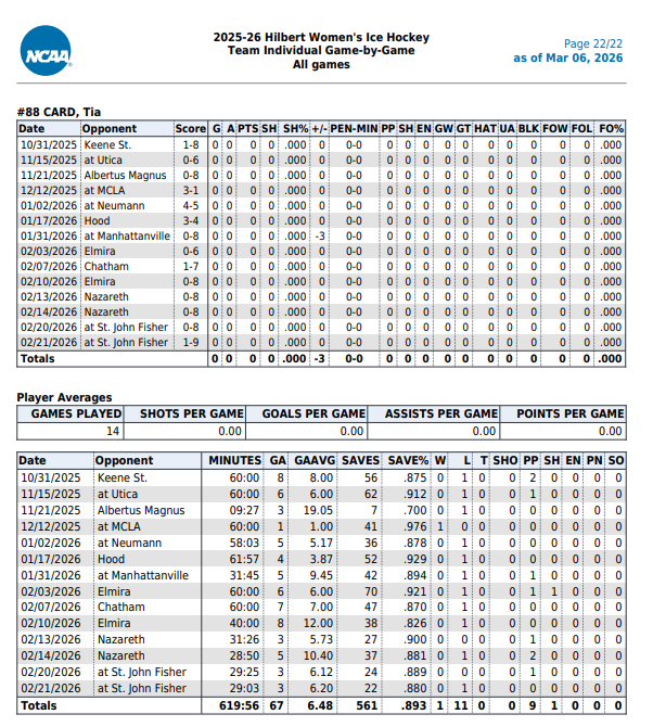 2025-26 senior ... named Hawk of the Week Dec 15 ... appeared in 15 games making 12 starts... posted 6.48 goals against average and .893 save percentage... earned 3-1 win over MCLA... recorded at least 50 saves in a game four times... stopped a season-high 70 shots vs Elmira...season stats